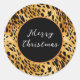 This round sticker is shown in a animal leopard print with a Merry Christmas wish.