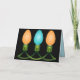 A trio of colourful holiday light bulbs all in a row are featured in the Christmas graphic decorating this holiday greeting card in hues of orange and blue with green cords between. Inside text may be personalised.