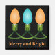 Three colourful holiday light bulbs all in a row are featured in the Christmas graphic decorating this magnet in hues of orange and blue with green cords between. Text may be personalised.