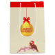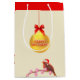 Beautiful gift bag with a big golden Christmas ball and Christmas little bird on light beige background.