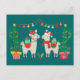 This Christmas postcard features llamas wearing red scarves and red hats, and carrying gifts on their backs. There are decorated cacti and more gifts nearby.