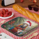 A colorful parrot wearing a Santa hat sits on a branch in a lush jungle, holding a cocktail with a candy cane garnish