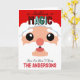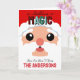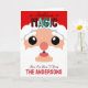 Season Greetings with this cute Santa card. A big happy Father Christmas face with black button eyes and a pink button nose, a big fluffy beard and a red hat with a white trim. At the top of the card reads "Christmas" (in black text) and below that "magic" (in red and green text). At the bottom of the card reads "from our house to yours" (in black text) and a template to add your family name in red text.