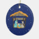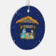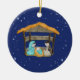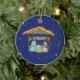This Christmas ornament is designed with blue starry night back ground with a manger attached to it.