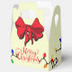 This favor gift box is printed on with an image of Merry Christmas on front and back along with Christmas tree lights wrapping around the entire box. Two large red bows cap the front and back panels. Change color of text if desired.