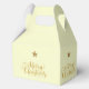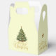 This favor gift box is printed on with a single Christmas tree in green. Festive text of Merry Christmas wraps around the box on ivory background with small decorative gold stars and a medium sized star graces the top.