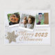 Christmas postcard featuring three of your family's photos with rustic Christmas snowflakes and family name text.