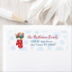 This festive Holiday return address label has an image of a red and white snowflake decorated mitten filled with lots of Christmas goodies, including candy canes, gift packages, an orange slice, and gold bells. Your text is in red and blue at the right side. The image and text are placed on a subtle blue snowflake background.