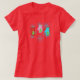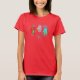 This t-shirt features three colours of winter mittens each with a Christmas tree and dots with blue snowflakes.