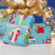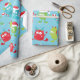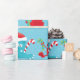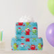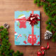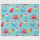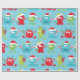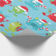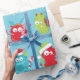 Fun, silly, colourful holiday wrapping paper features Christmas monsters with Santa hats, gifts, and candy canes on a blue background.