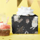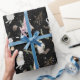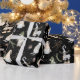 Cute Christmas moose and gnomes skiing on black background with snowflake overlay.