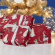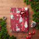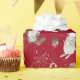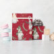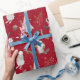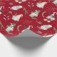 Cute Christmas moose and gnomes skiing on red background with snowflake overlay.