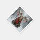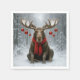 In a snowy forest, a moose sits gracefully, adorned with a bright red scarf and festive red baubles hanging from its antlers