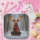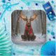 A moose sits in a snowy forest, its antlers adorned with glowing lights, and wearing a bright red scarf that adds a festive touch