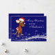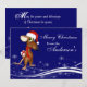 Cute cartoon mouse with a Santa hat on holding a present behind his back. A deep blue background with white snow features makes for a very cute, fun and festive Christmas greeting card design.
