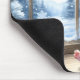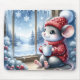 A cosy mouse in a red sweater and hat sits by a frosted window holding a cup of hot cocoa while admiring a snowy landscape with pine trees and snowflakes