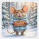 A charming mouse dressed in a cozy blue winter coat, proudly displaying a "Merry Christmas" sign amidst a picturesque snowy forest where delicate snowflakes gently fall.