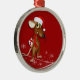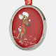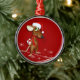 Cute cartoon mouse with a Santa hat on holding a present behind his back. A deep red background with white snow features makes for a very cute, fun and festive Christmas ornament design.