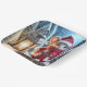 A cute mouse dressed in a Santa outfit stands on a snowy tree stump beside a glowing lantern