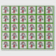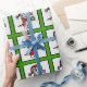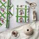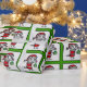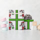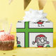 Funny cartoon mouse with stick arms and legs, pink nose, and googly eyes wearing a Santa suit, carrying a gift in green wrapping paper and a bow. Brighten up your Christmas gifts with this fun and unique wrapping paper. Original digital cartoon art by Taylor Addams.