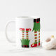 Ceramic coffee mug is shown with a festive Christmas holiday Elf art print with Merry Christmas in text.