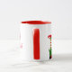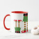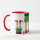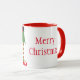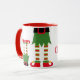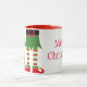Ceramic coffee mug is shown with a festive Christmas holiday Elf art print with Merry Christmas in text.