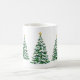 Holiday ceramic coffee mug shown with a festive Christmas trees print design.