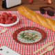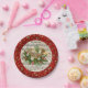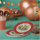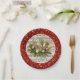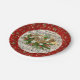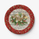 The centerpiece of these paper plates is a french horn decorated for Christmas with pine sprigs, holly leaves, red berries, and flowers, against a vintage sheet music carol. Around the edge is a red faux metallic background with a pattern of gold music notes.