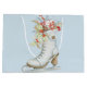 Lovely watercolor graphic features vintage style ice skating shoe filled with Christmas foliage and present on light blue background