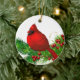Christmas Ornament shown in a round shape and is made of porcelain with a holiday print design of a red cardinal bird.