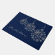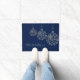 Stylish holiday door mat done in dark blue, with graphics of silver tone snowflake Christmas ball ornaments. Personalise the grey text to read what you want. What a lovely way to welcome guests to your home during the holidays.