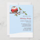 Adorable cartoon illustration of a cute brown owl wearing a red scarf perched on a tree on a blue snowy background.