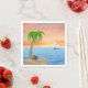 Holiday palm tree with lights, a gift, ornaments, and a boat on ocean water.