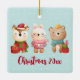 An ornament with a cute illustration featuring a bunny, a bear and a deer all dressed in festive gear. Adorable and whimsical.
