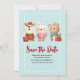 Save the date card with a cute illustration featuring a bunny, a bear and a deer all dressed in festive gear. Adorable and whimsical.