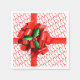 Paper party napkins with image of a red bow, candy canes and green holly for a festive Christmas scene.