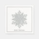 These standard style napkins are shown in the cocktail size. Shown with a single, bold silver-colour snowflake in the centre on a white background, a thin silver-grey border with white outer border edges, and text reading Merry Christmas.