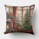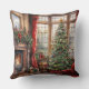 A beautiful warm and cosy red and green pillow, of a living room setting with a red chair, window and Christmas tree