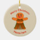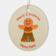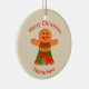 This ornament features a cute cartoon of a colourful gingerbread woman. She has black eyes with white pupils and pretty black eyelashes and a big smile on her face. She also has red and green tassels on her skirt and top ready for a Christmas party.