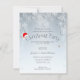A beautiful invitation with an featuring a santa hat, an ornament and some snowflakes.