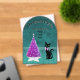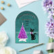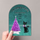 This Frosted acrylic Christmas Party invitation has a pink tree with shiny silver stars on a white star rug next to an elegant black cat wearing a pink bow in a room with teal walls and floors. Customise all the text with the templates.