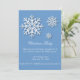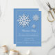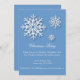 Holiday Christmas party invitation. Blue background and white snowflakes.
