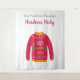 A tapestry for a fun holiday season and Christmas parties, dinners. A chic white background. Decorated with an ugly red, white, orange and green xmas sweater. Personalise and add your family name, black letters. The text: Christmas Party is written in red with a modern hand lettered style script. Can be used as a welcome sign, party wall decoration or as photo booth backdrop.