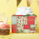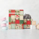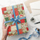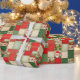 A hodge-podge of Christmas elements, including Santa Claus, holly, and snowflakes in red, green, and white makes cute wrapping paper that's perfect for your holiday gifts.