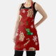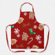 Festive Red Christmas apron that features snowflakes, candy canes, gingerbread houses, bows, and Christmas stockings.