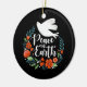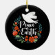 A pretty Christmas ornament featuring a dove in a floral wreath with the words Peace on Earth. The Christmas ornament is designed in black, red and white. An elegant holiday ornament for your Christmas tree. Designed for you by Blackberry Boulevard.