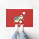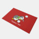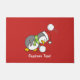 A little penguin cartoon wearing santa hat and green scarf bending to get a snow ball avoiding another one.