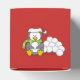 A little penguin cartoon with santa hat and green scarf sitting and holding a snowball.