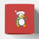 A little penguin cartoon with santa hat and green scarf walking on snow.