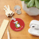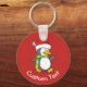 A little penguin cartoon with santa hat and green scarf walking on snow. Custom background colour. Custom text on both sides.